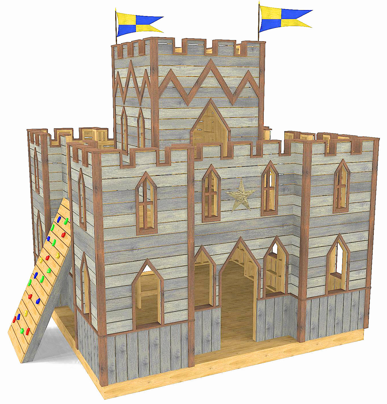 The Enchanted Castle Playset Plan brings big imagination to life with a bold, boxy design that’s anything but ordinary. Built on a simple square footprint, this castle features a wraparound second level, four jutting corner turrets that pop out from the main structure, and an elevated third-level keep that towers over the rest. It’s the perfect launchpad for backyard battles, royal parades, or secret missions from the high lookout.