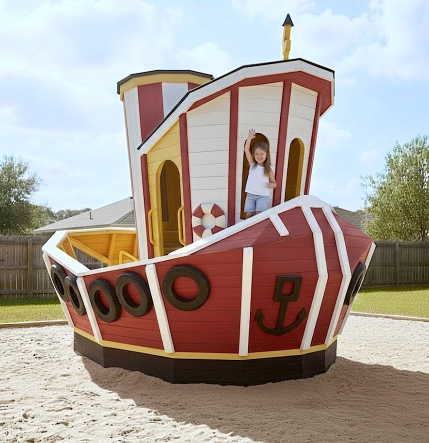 Toot up your imagination with the Rusty the Tugboat Playset Plan, a caricaturesque backyard tugboat that’s built for fun and friendly adventure. Rusty’s exaggerated framing and angling give it a delightful storybook look, while the wraparound deck and elevated cabin invite kids aboard for nautical pretend play. With about 60 sq ft of usable space, it’s the perfect size for kids aged 3 to 7 to steer imaginary waterways or tow hidden treasures across the garden.