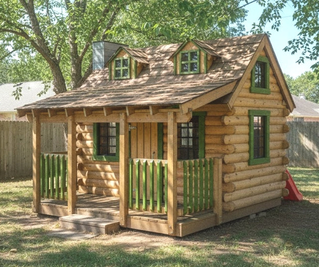 Step into rugged yet inviting charm with the Adirondack Log Cabin Playhouse Plan, a rustic retreat inspired by mountain lodge architecture. This timeless 10×10-foot play cabin features a covered front porch, dual dormer windows, and a decorative chimney that gives it ravishing appeal. With space for up to seven shed style windows, it fills naturally with light, while the classic log framing and pitched roof create a warm, woodland hideaway perfect for relaxed afternoons or imaginative outdoor play.