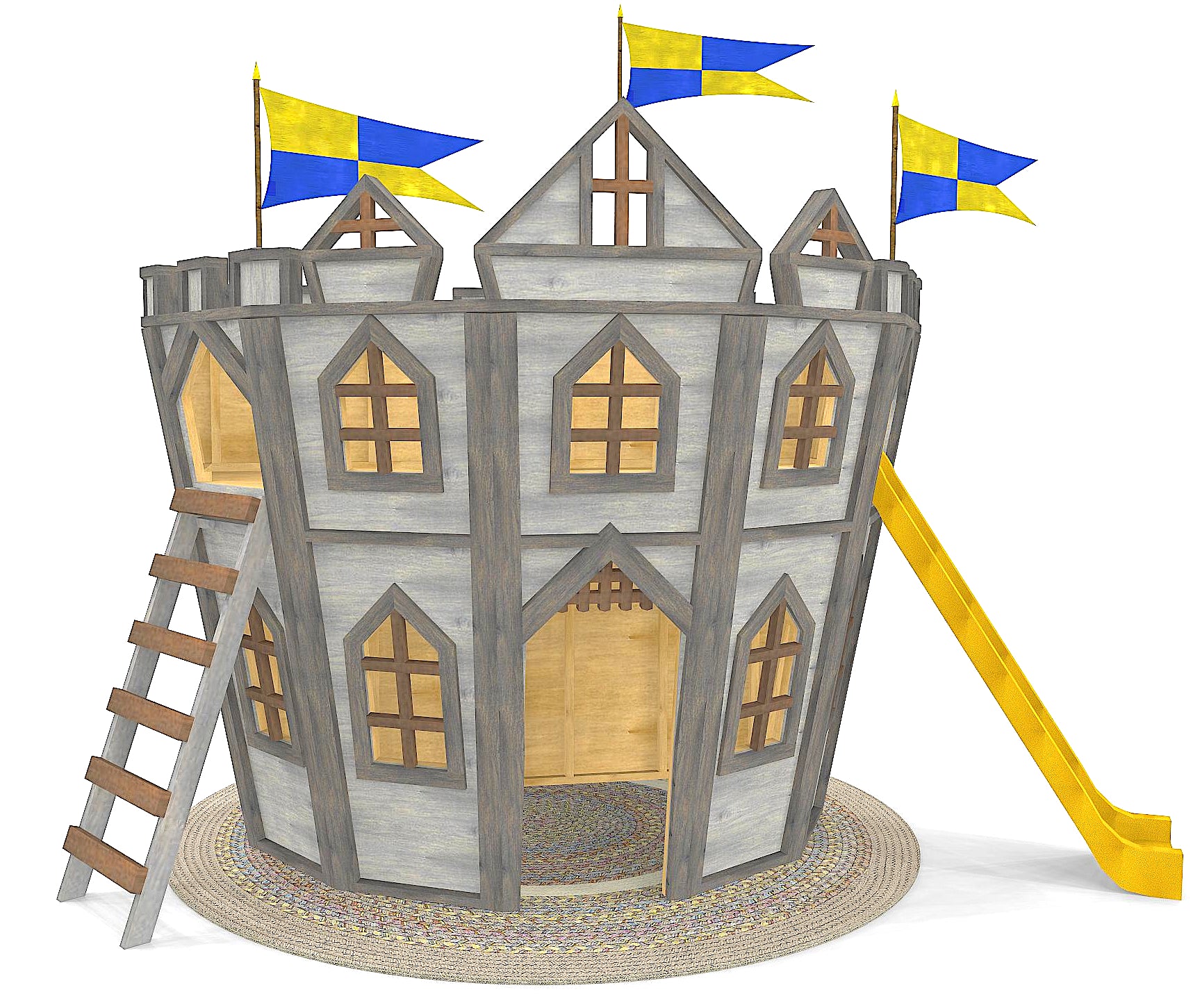 Step into a world of wonder, without ever stepping outside, with the Storybook Indoor Castle Playhouse Plan. This magical mini-castle brings fairytales to life right in your living room, playroom, or nursery. With gently flared walls, peek-through windows, and five fun doorways, it’s perfect for sneaky escapes, royal entrances, and endless pretend play. Built to nestle against a wall, it even supports a full-sized slide for extra indoor adventure.