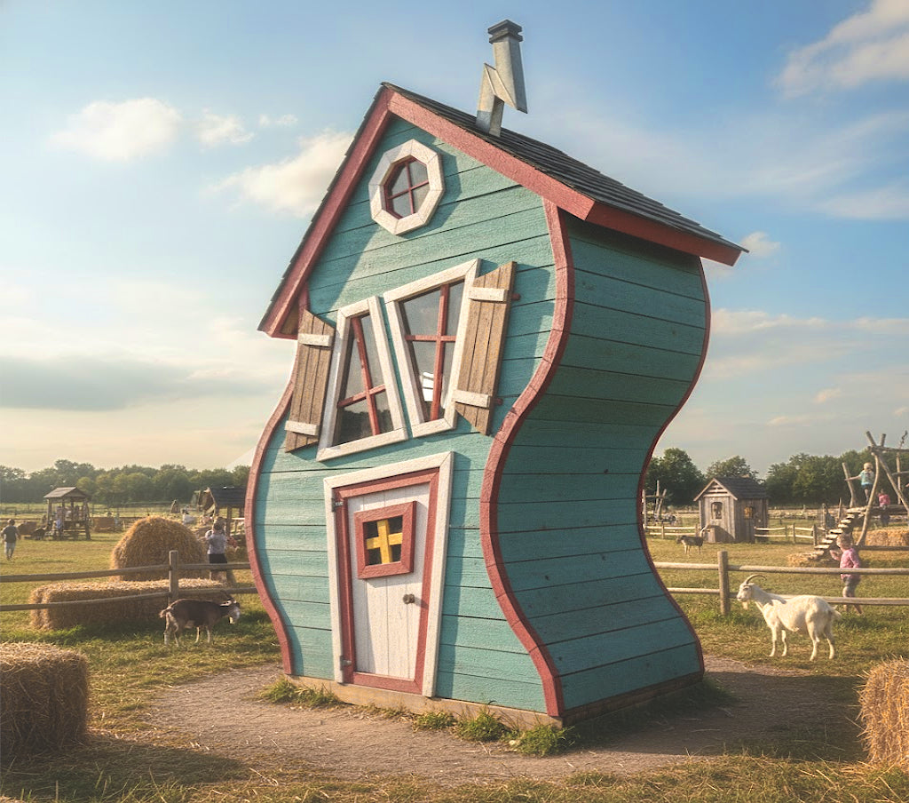 Designed so that every angle invites laughter. The included loft can act as a secret hideout or a snug sleepover spot, while the main level might host puppet shows, tea parties, or wild invention labs. Add flags, fairy lights, flower boxes, and a slide, and this wavy, windblown hideaway becomes the coolest spot in the neighborhood, a place that turns your backyard into a daily adventure.
